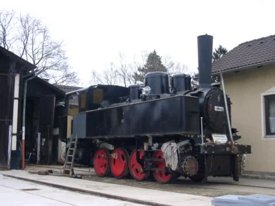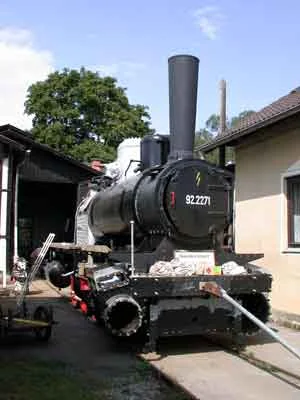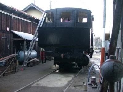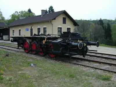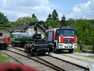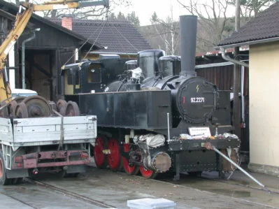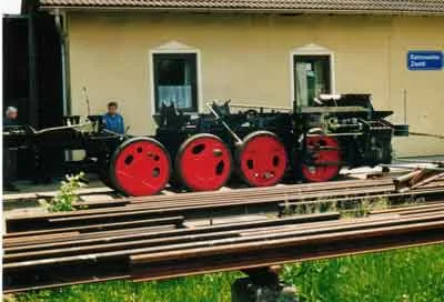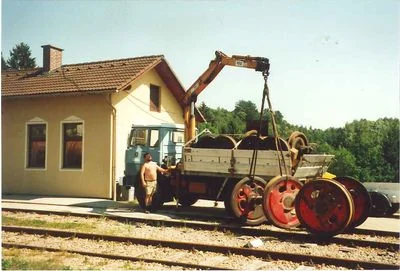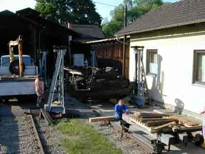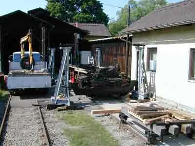 Nun steht der Rahmen auf der Hebebühne vor dem Heizhaus Zwettl. (06-2000)