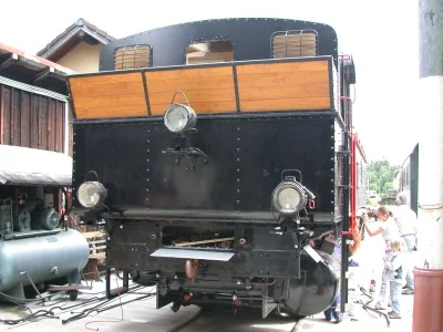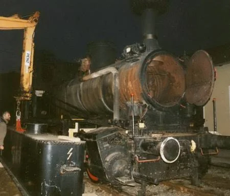 Mit dem Kranwagen wurde ein Wasserkasten abgehoben, um ihn reparieren zu können und um den Kessel für die im Sommer 1998 vorgesehene Kesselhauptuntersuchung freizulegen (01-1998, Thomas Wasinger)