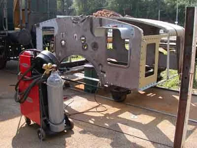 Auch die Sanierung des Führerhauses schreitet zügig voran. Der Rahmen und die Bleche sind sandgestrahlt, werden ausgeschweißt und grundiert. (08-2002)