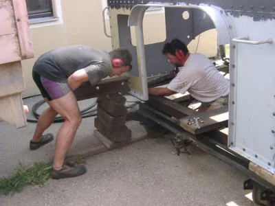 Mit vereinten Kräften werden die einzelnen Bleche der Feuerboxverkleidung montiert. (09-2002, Thomas Anton)
