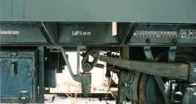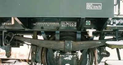 Achse mit Gleitlager, Blattfedern und der Aufschrift für die höchste zulässige Geschwindigkeit (03-1998)