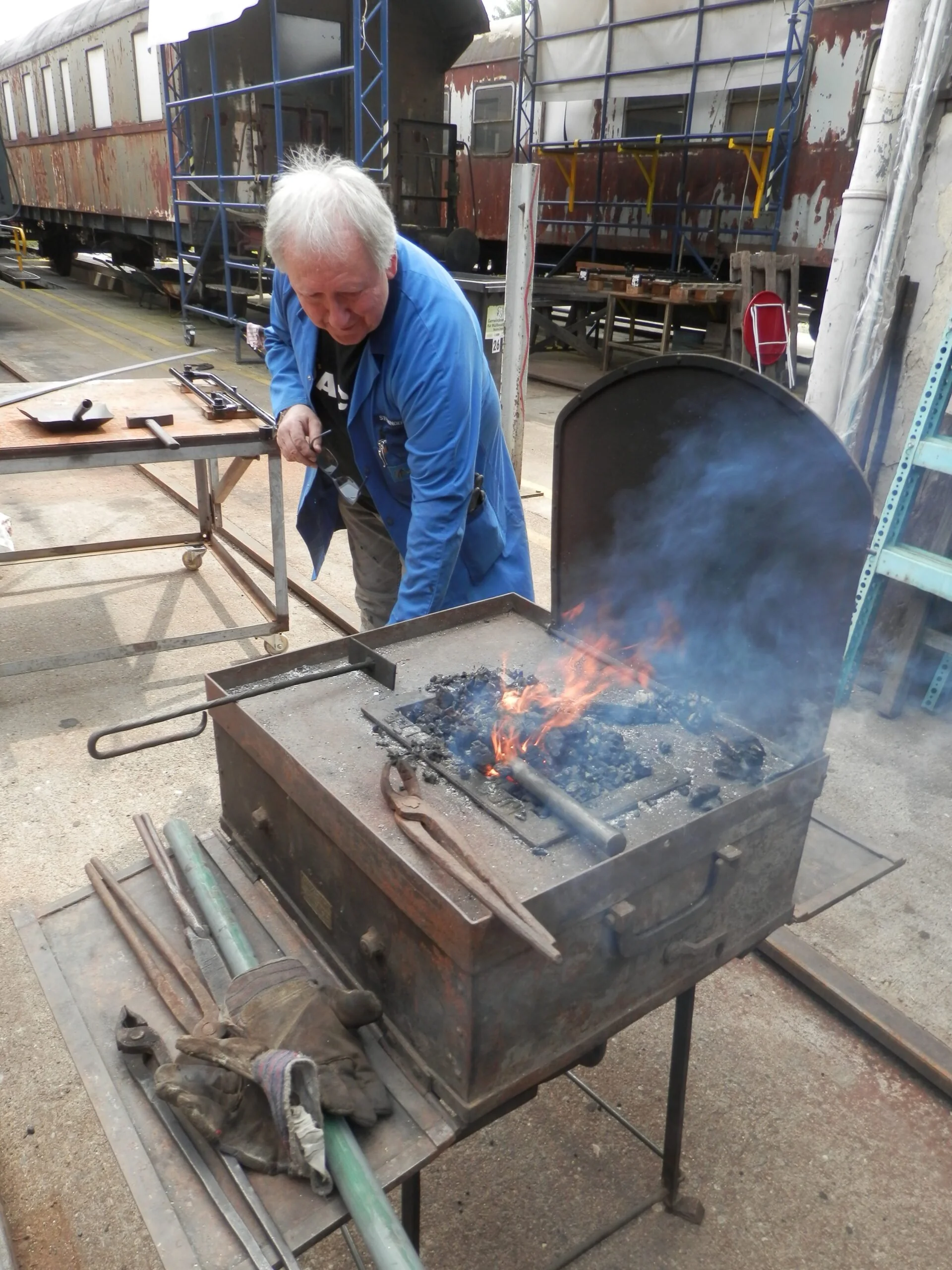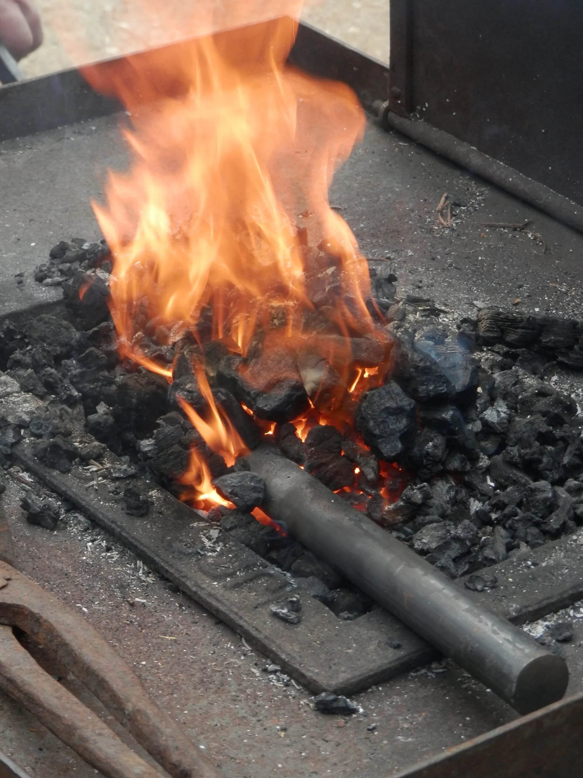 Vorlegestange: Das hellrot glühende Teil wird aus der Schmiede genommen (25.06.10, Wolfgang Düll)