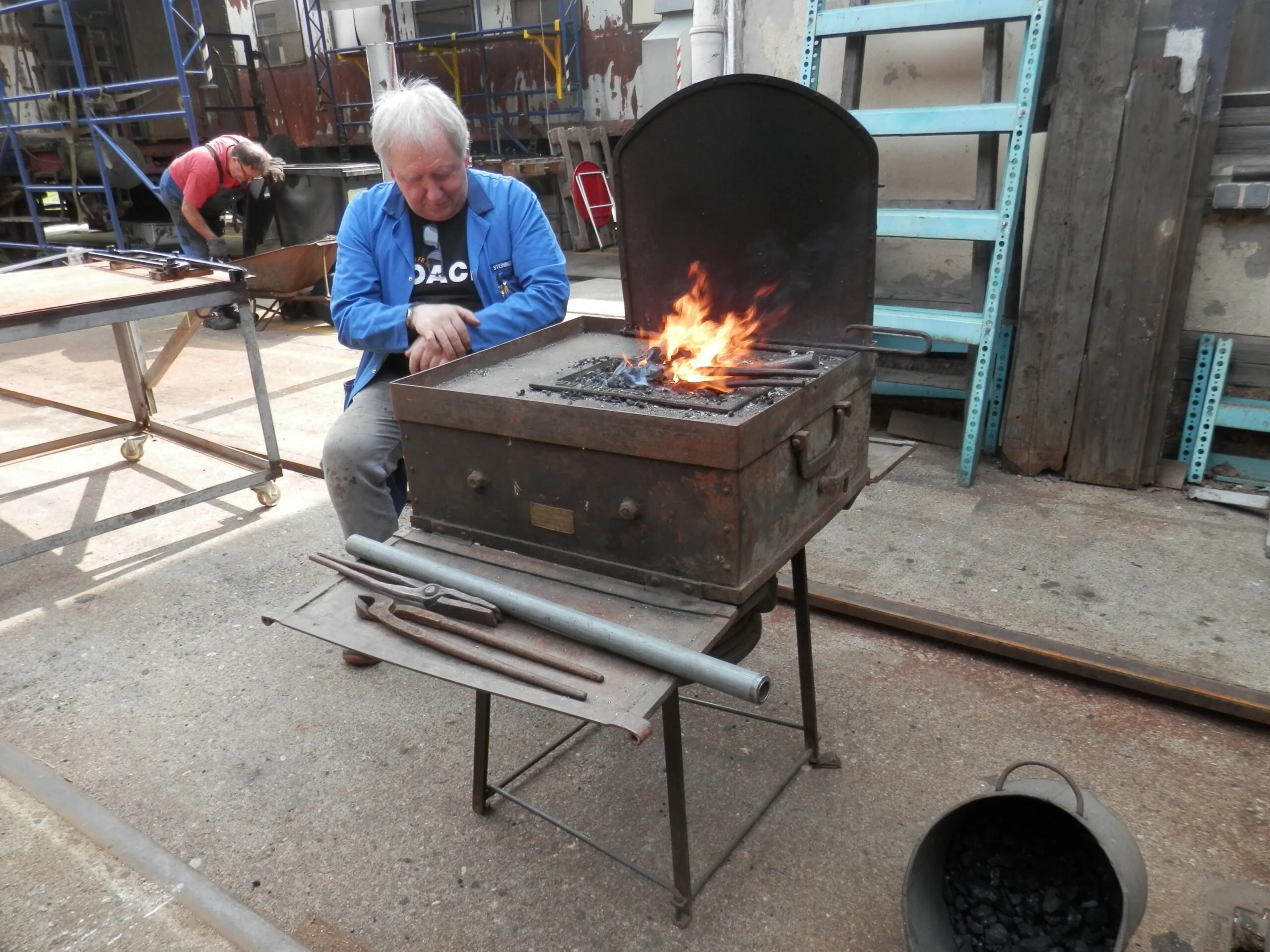 Vorlegestange: Das 25er Rundmaterial wurde in der Schmiede bis zum Glühen erhitzt und wird in die Hilfsvorrichtung eingesteckt (25.06.10, Karl Wasinger)