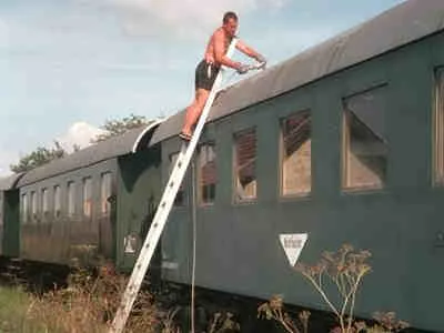 Abschleifen und Ausbesserung der Dachlackierung des Spantenwaggon Bih 39 025 im August 1997 (08-1997, Karl Wasinger)